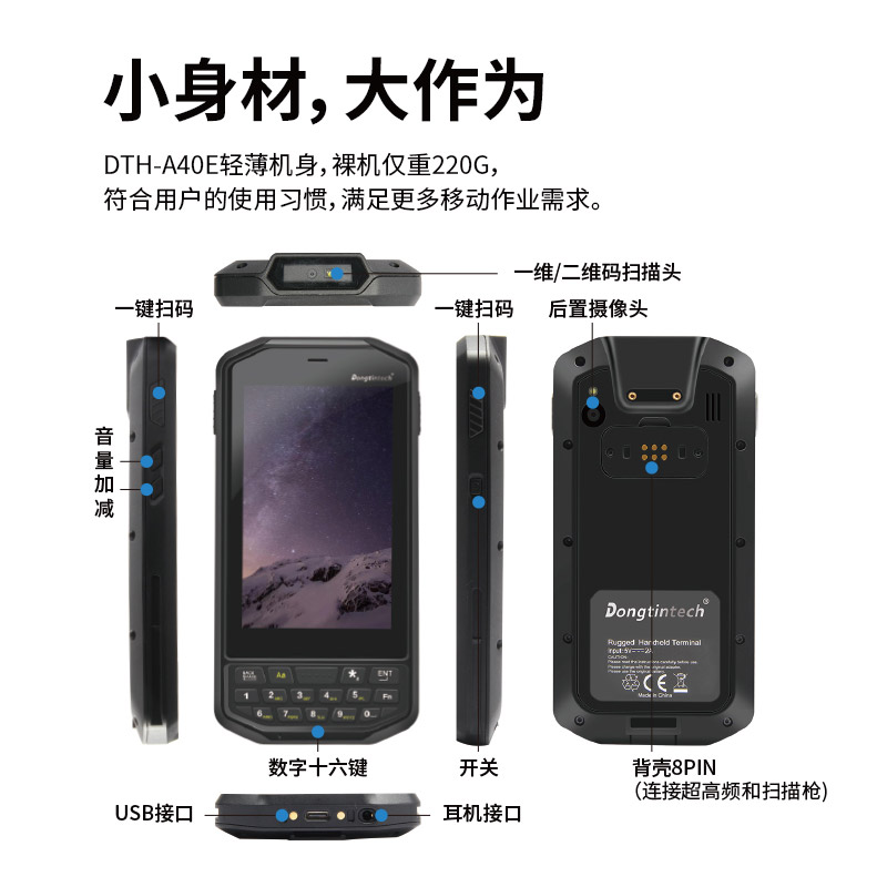 型號:DTH-A40E,概述:東田三防4英寸三防手持機,超高清輕薄手持機,支持64G內存,小身材大作為,多端口設計,滿足更多移動作業需求。
