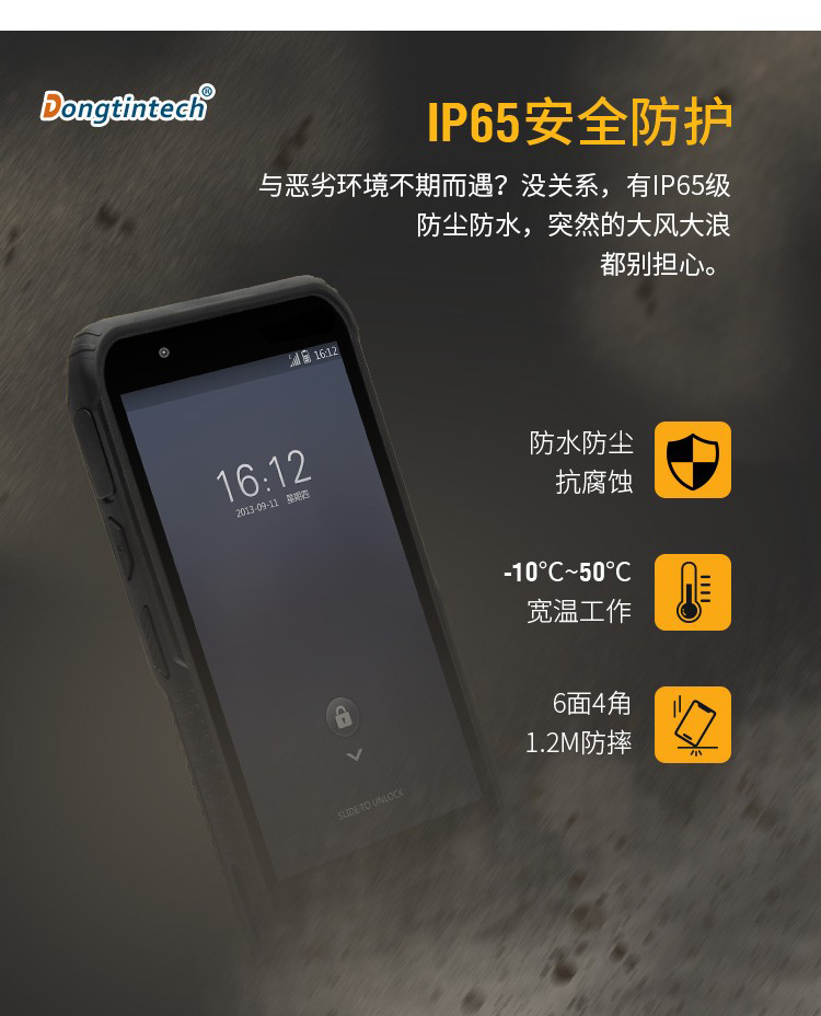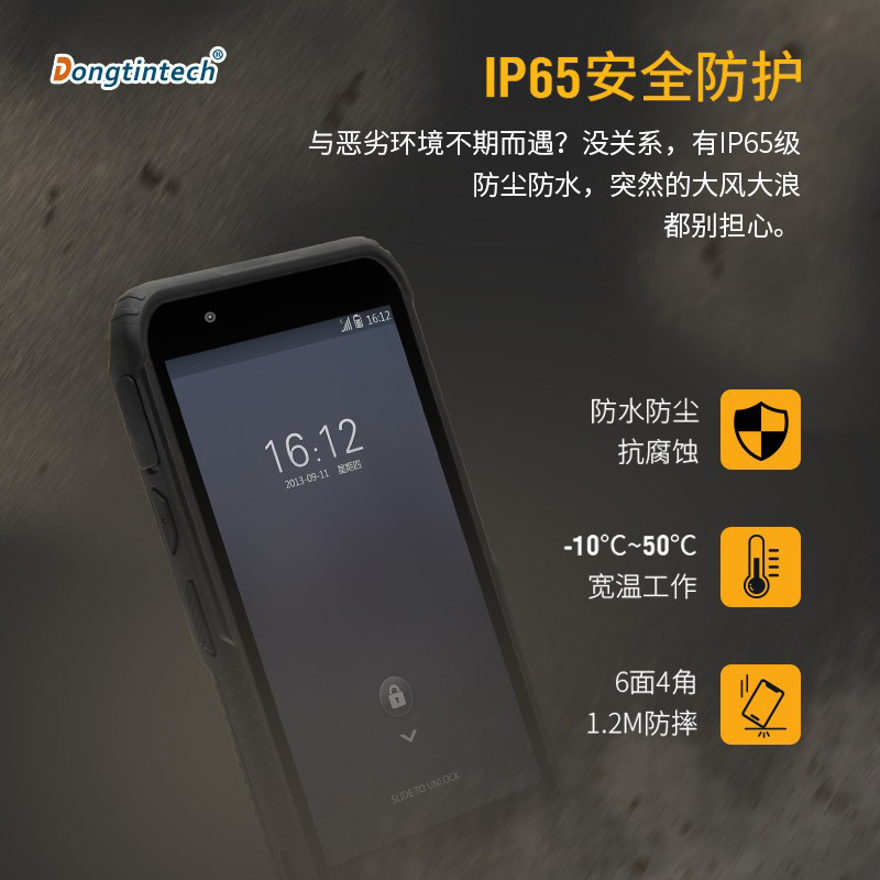 型號:DTH-I60E,概述:東田三防6英寸三防手持機(jī),支持一維二維掃碼,讀取自如,輕薄機(jī)身,采用IP65級防護(hù),不懼戶外工作。